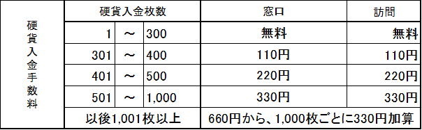 令和6年10月1日より両替手数料を改定しています。1.預金関連手数料 ・硬貨入金手数料(令和4年2月1日より徴求開始) 2.融資関連手数料 ○ 取引履歴照会関連手数料 照会依頼日より10年以内 照会依頼日より10年以上 取引履歴検索 1口座あたり440円(税込)ただし出力枚数が20枚を超える場合は超える枚数×55円(税込)を付加 1口座あたり1カ月440円(消費税込) 解約時期照会 1口座当たり440円(税込)(解約時期が10年以内の場合) 1口座当たり1.100円(税込)(解約時期が10年以上の場合) 月末口座情報照会 一顧客あたり1,100円 1顧客あたり1カ月880円(消費税込) 上に戻る